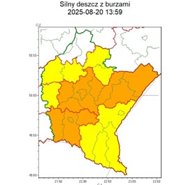 Przebieg: Prognozowane są opady deszczu o natężeniu umiarkowanym, okresami silnym. Wysokość opadu miejscami od 30 mm do 45 mm. Opadom towarzyszyć będą burze z porywami wiatru do 55 km/h.