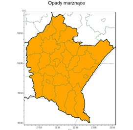 Przebieg:Umiarkowane lub silne opady marznącego deszczu lub mżawki, trwające nie dłużej niż 12 godzin lub słabe opady trwające dłużej niż 12 godzin. Opady będą powodować gołoledź.